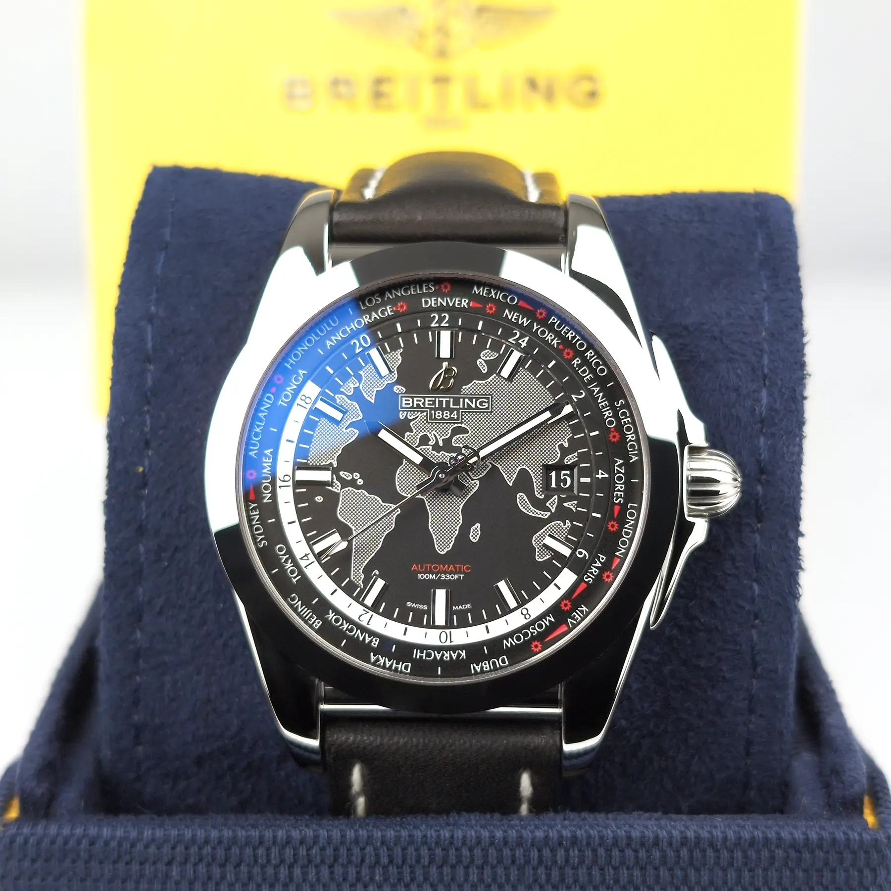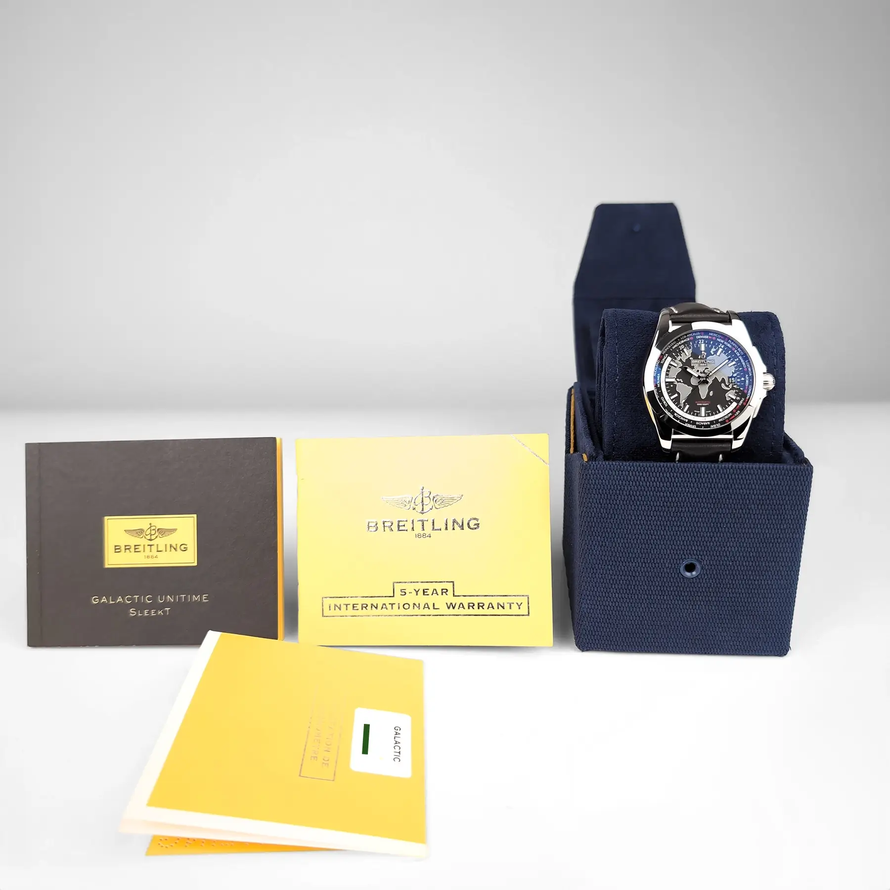 2022 Breitling Galactic Unitime WB3510U4/BD94 with black dial, box and card. This watch is in stock and available for immediate pickup or delivery. In person viewings available by appointment. Serial number intentionally obscured in photos when visible.