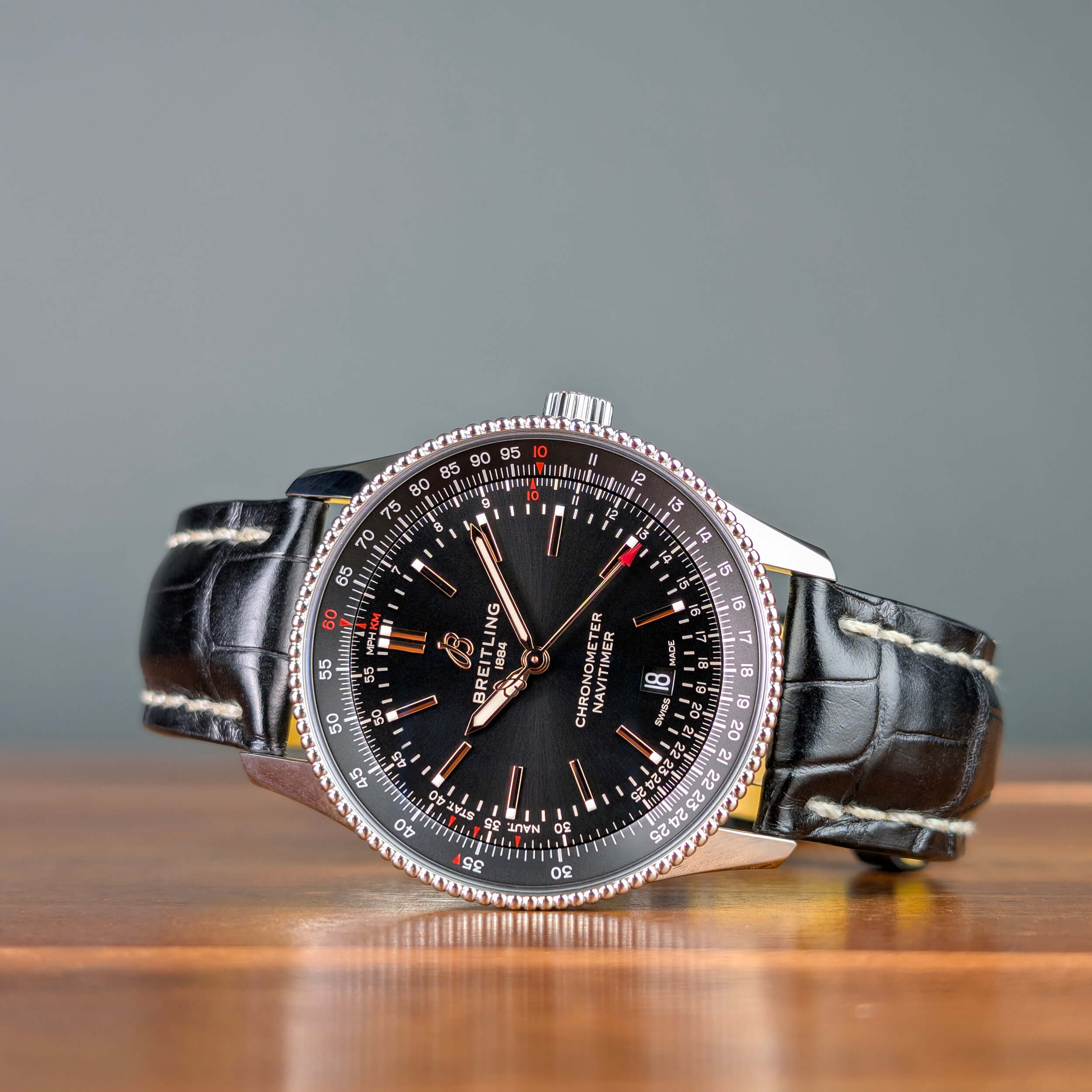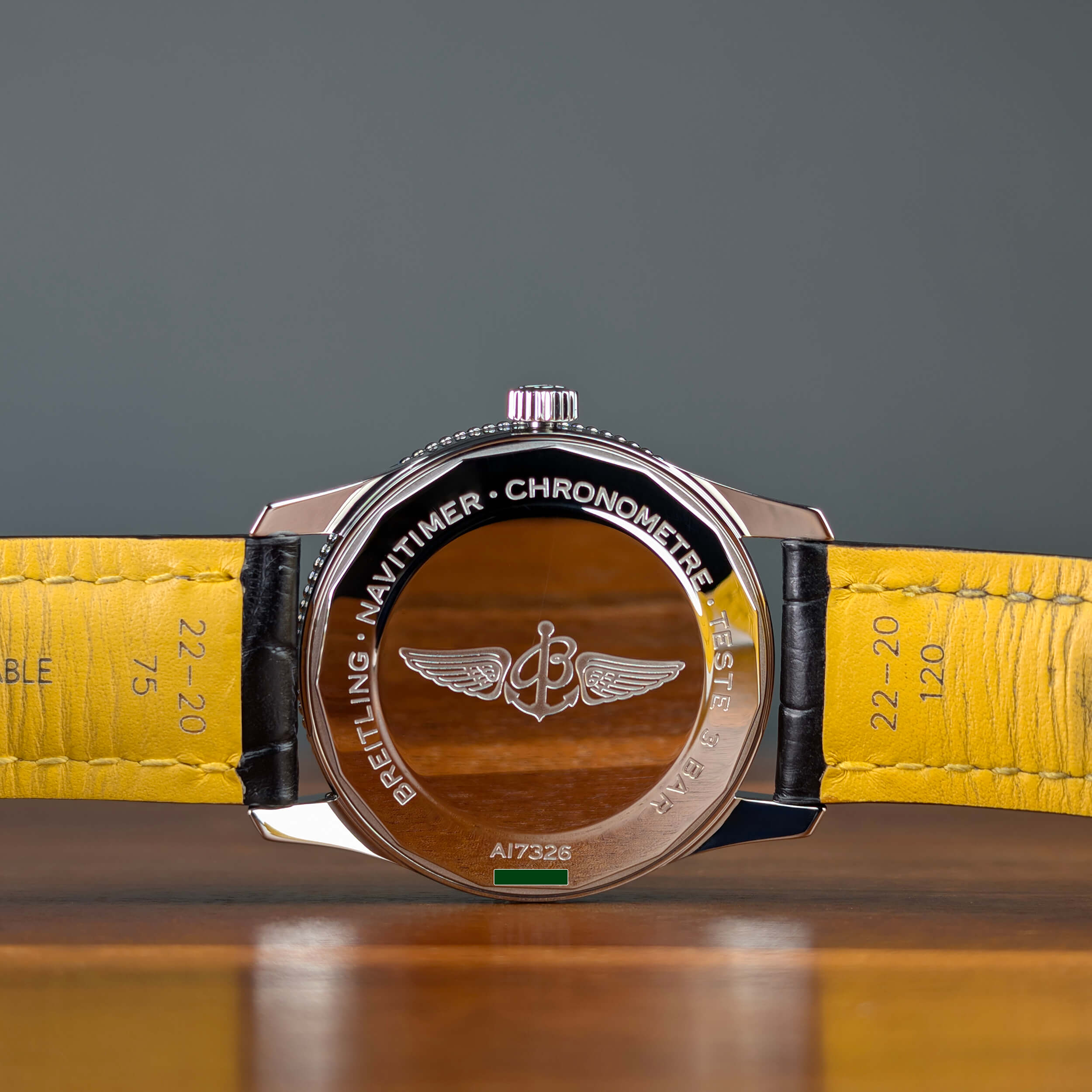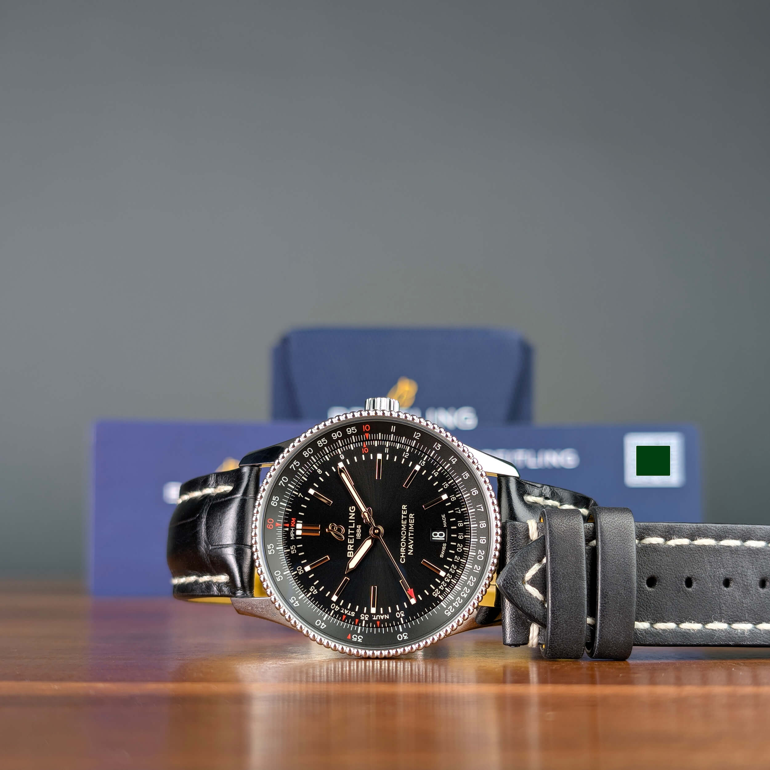 Complete set 2022 Breitling Navitimer Automatic 41 A17326241B1P2 with black dial and bonus Breitling strap. This watch is in stock and available for immediate pickup or delivery. In person viewings available by appointment. Serial number intentionally obscured in photos when visible.