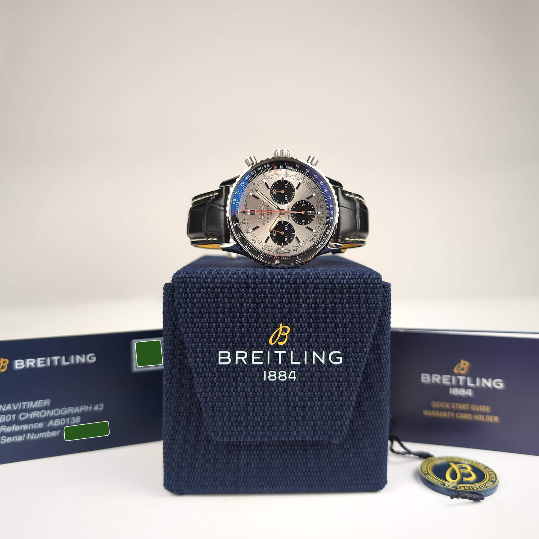 Virtually unworn 2024 Breitling Navitimer B01 Chronograph 43 AB0138241G1P1, a full set. This watch is in stock and available for immediate pickup or delivery. In person viewings available by appointment. Serial number intentionally obscured in photos when visible.