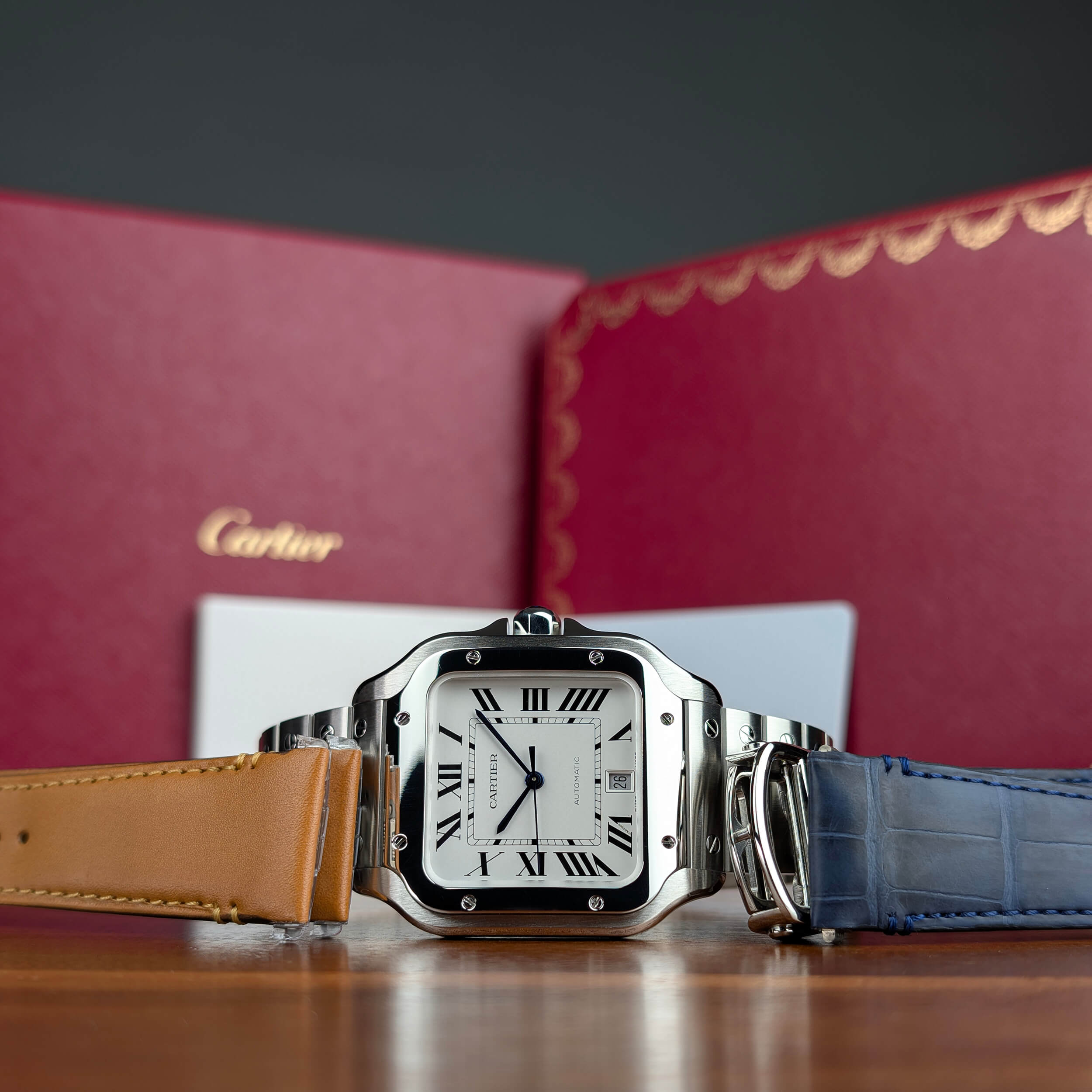 ACCESSORIES: This watch is a complete set. Included with this watch are its Cartier display box with outer box shell, Cartier guarantee card dated May 2024, operating manual, Cartier brown leather strap, and bonus Cartier blue alligator leather strap. Also included with this watch is an Insurance Appraisal and Certificate of Authenticity which will be performed by our in-house NAJA certified watch appraiser on the date of purchase and will feature your name as well as all of the relevant details regarding this watch.