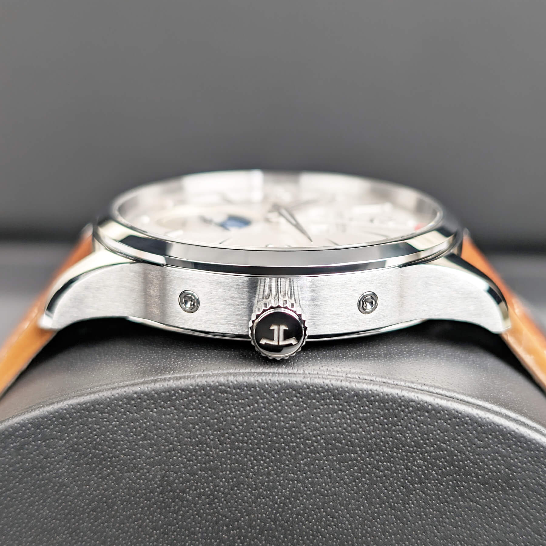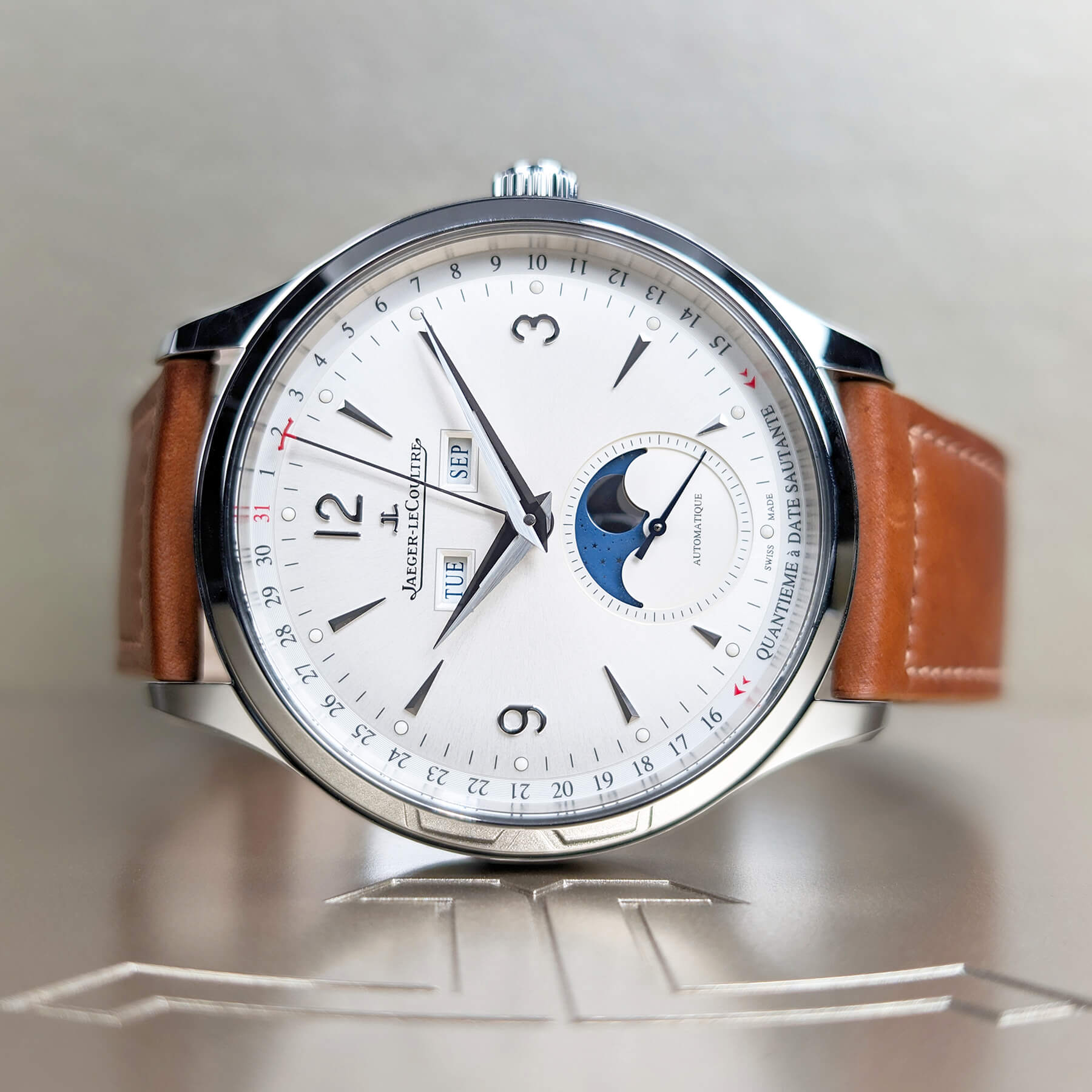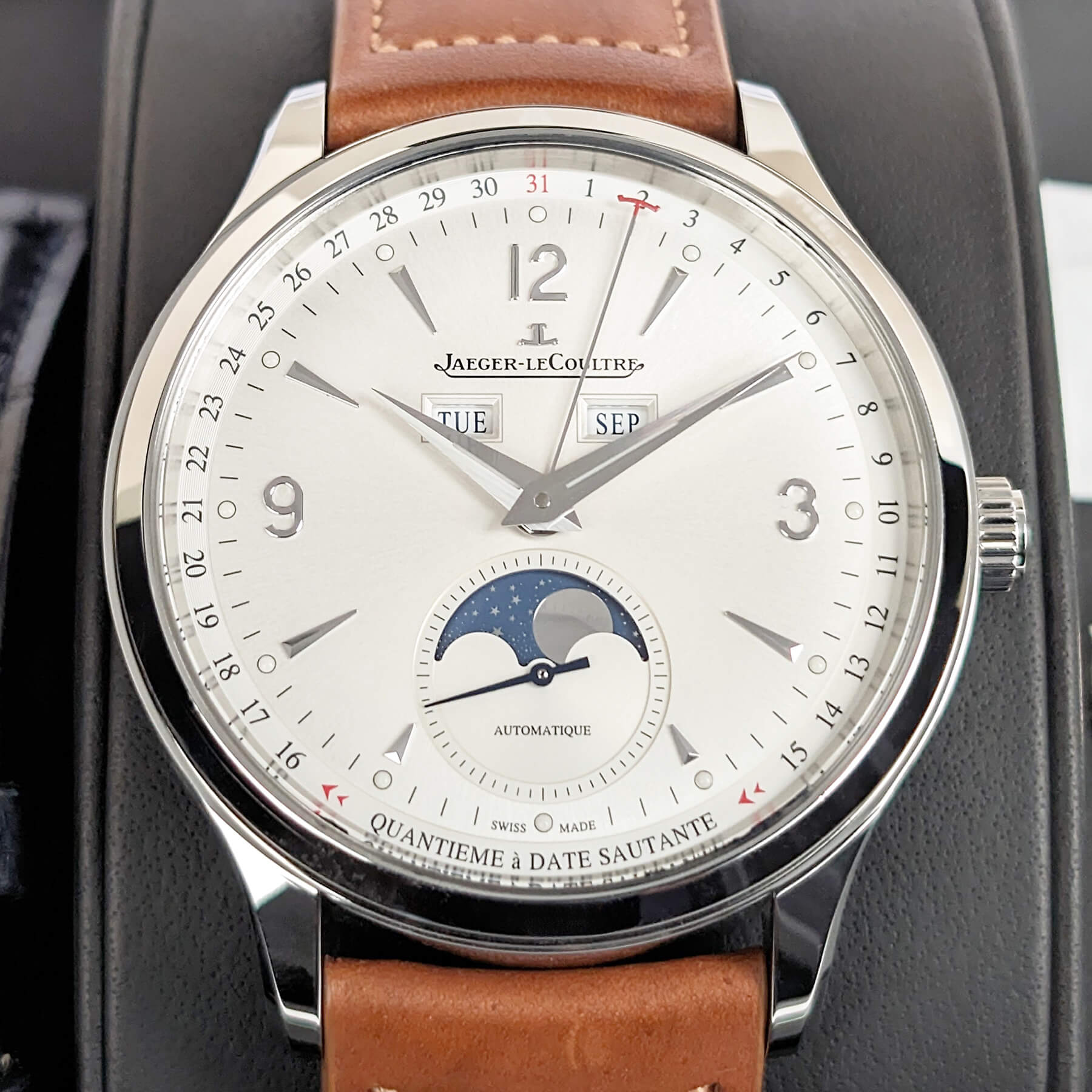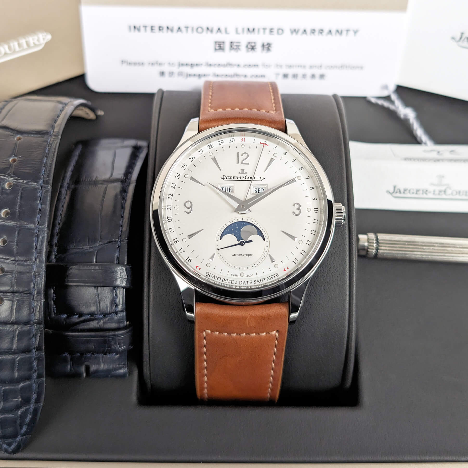 All-original preowned 2022 Jaeger-LeCoultre Master Calendar Q4148420 with two straps, box and card. This watch is in stock and available for immediate pickup or delivery. In person viewings available by appointment. Serial number intentionally obscured in photos when visible.