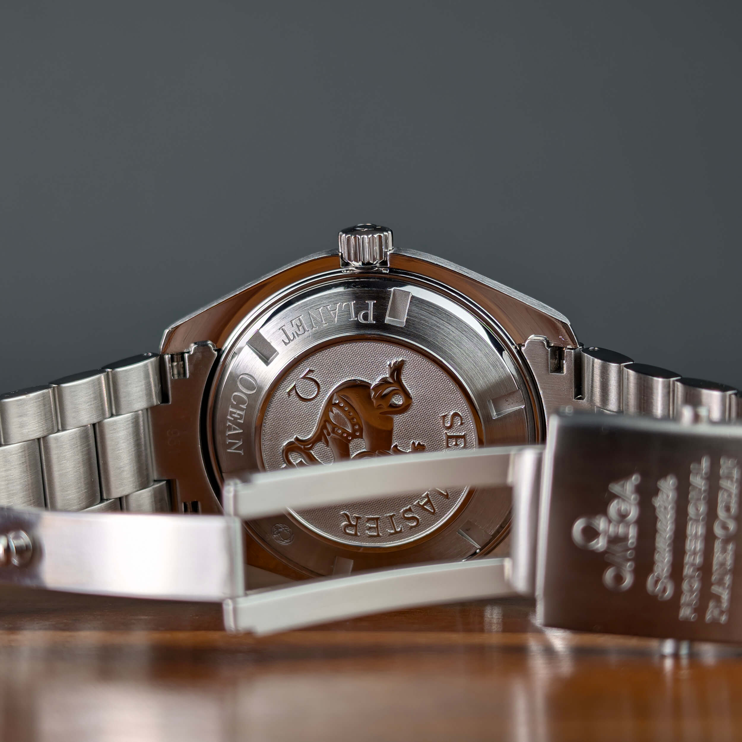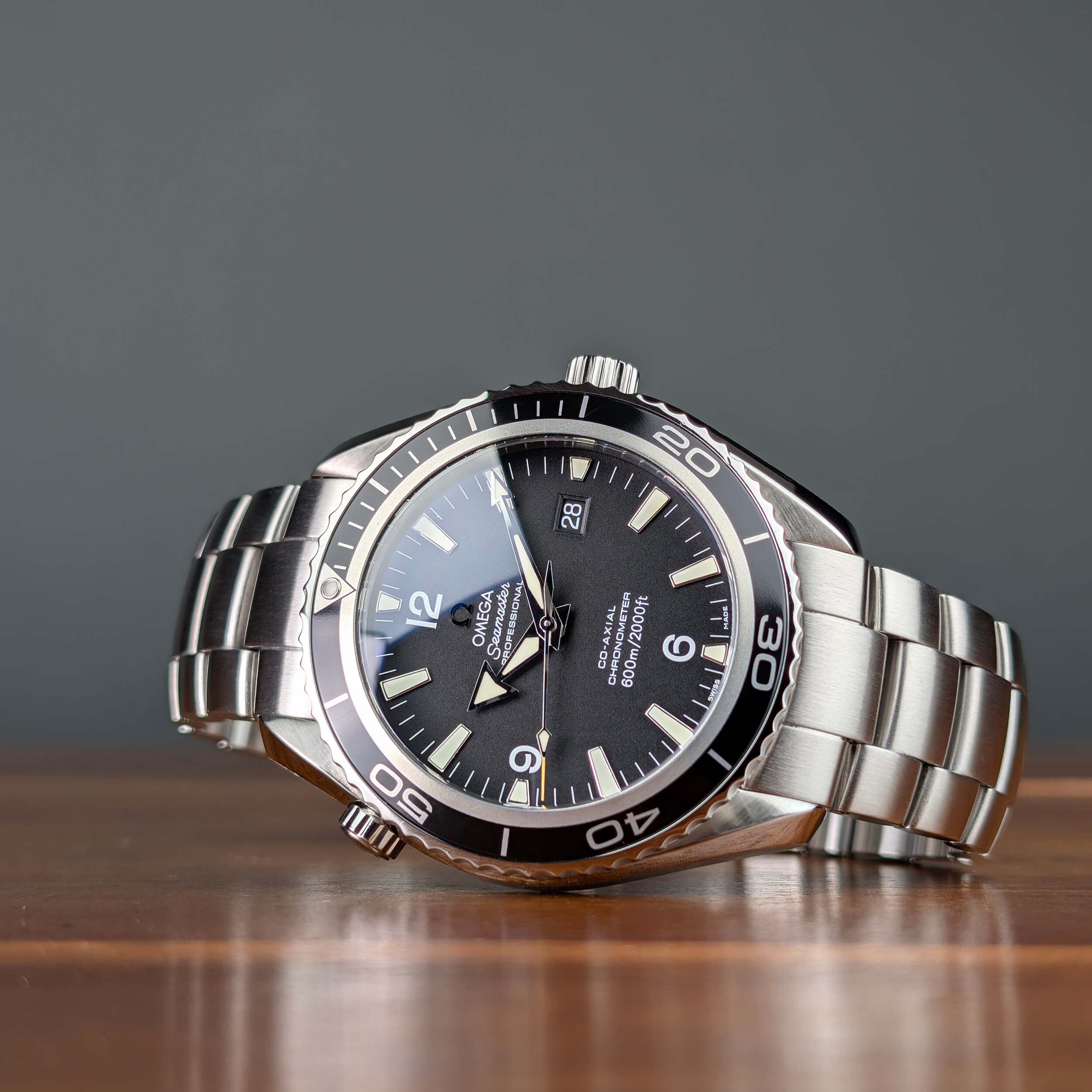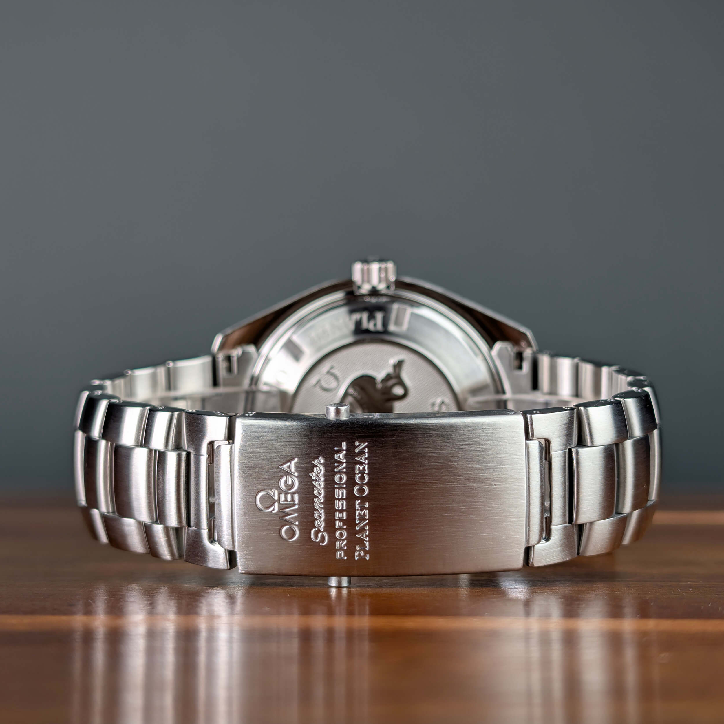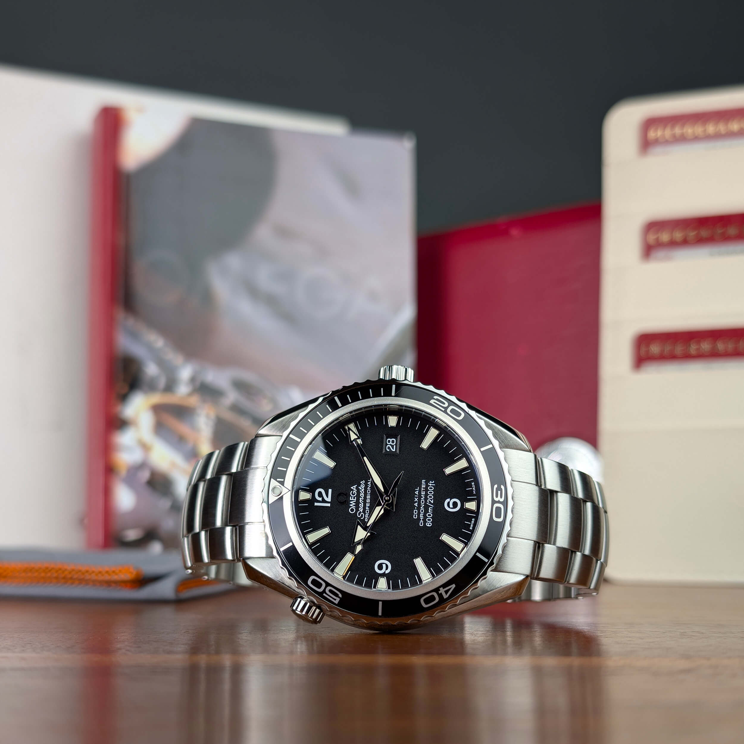 2007 Omega Seamaster Planet Ocean 2200.50.00, a complete set. This watch is in stock and available for immediate pickup or delivery. In person viewings available by appointment. Serial number intentionally obscured in photos when visible.