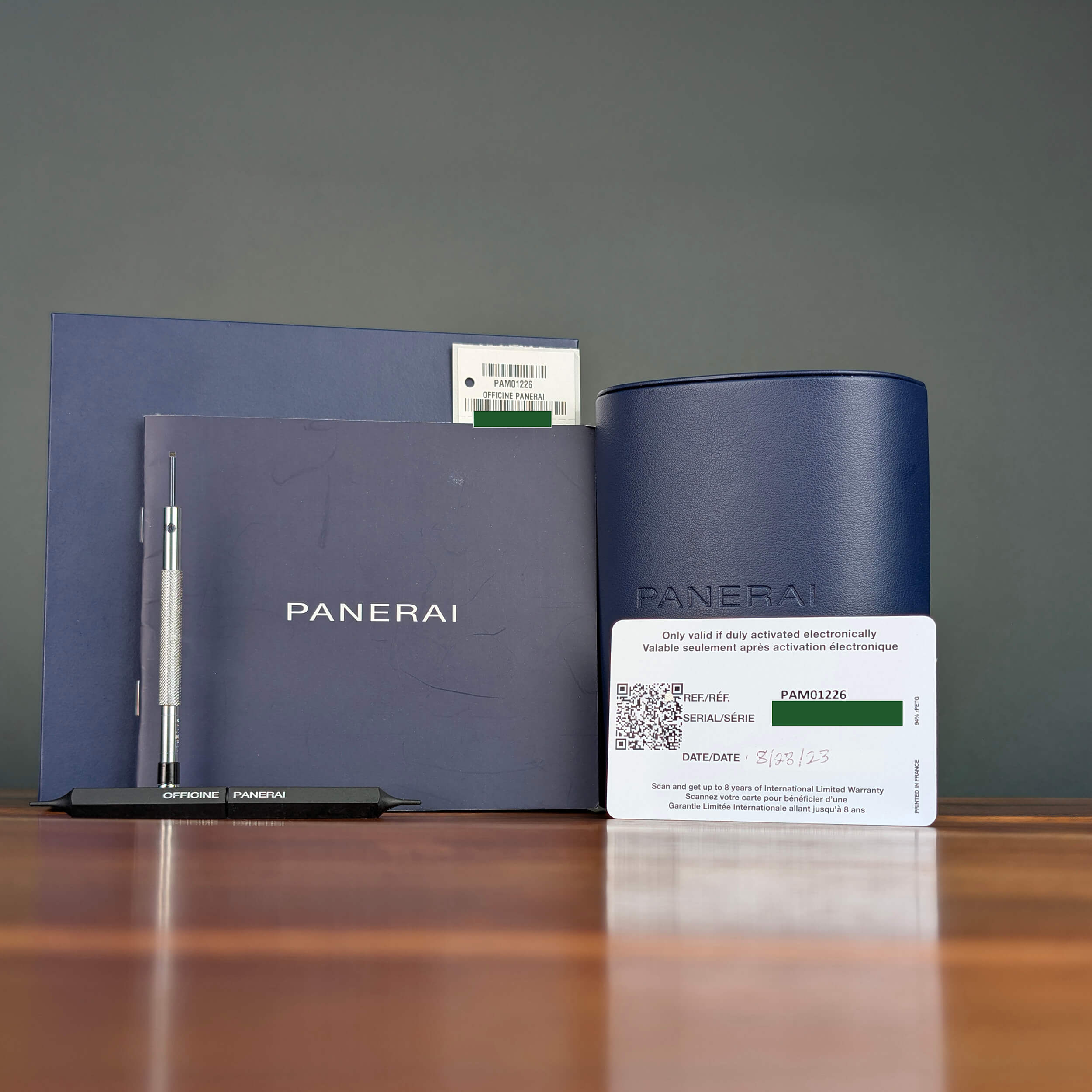 Complete set 2023 Panerai Submersible Quarantaquattro Bianco white PAM01226. This watch has only been worn on the rubber strap so the fabric strap is in brand new condition. This watch is in stock and available for immediate pickup or delivery. In person viewings available by appointment. Serial number intentionally obscured in photos when visible.