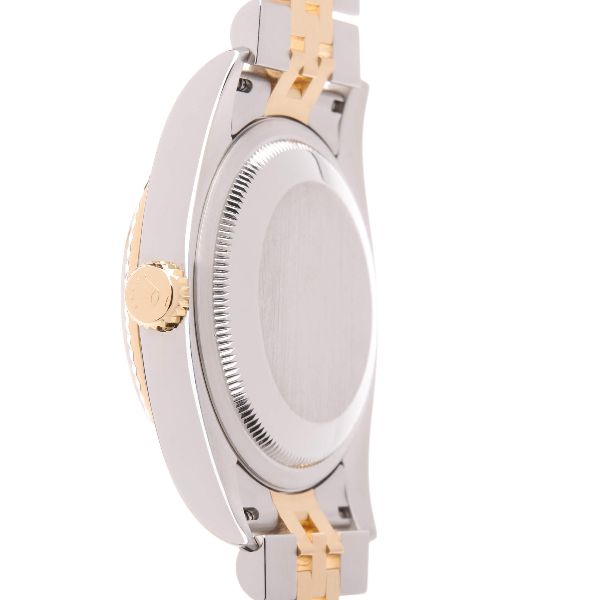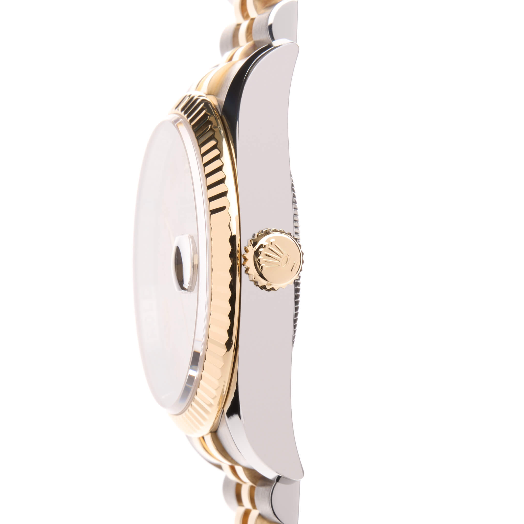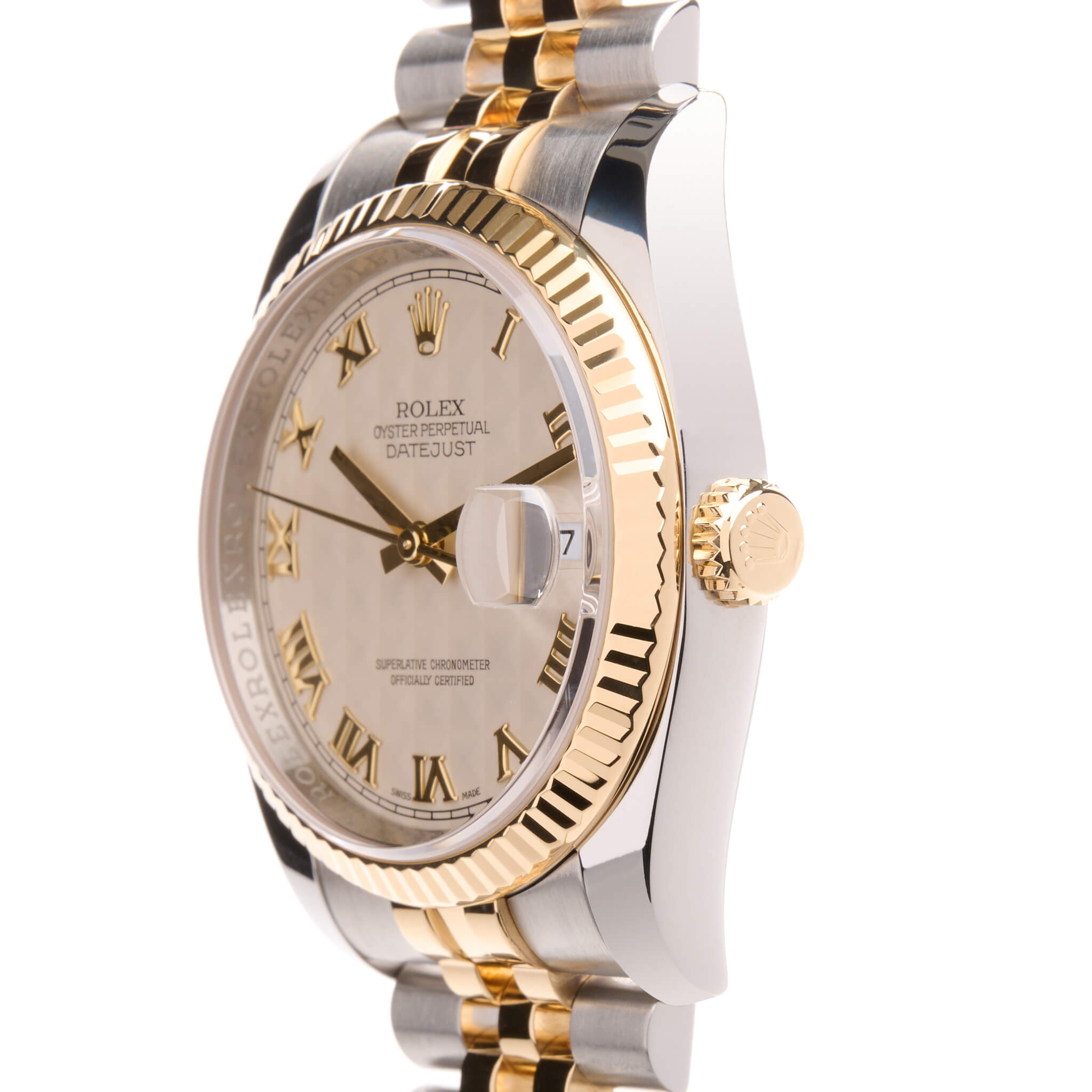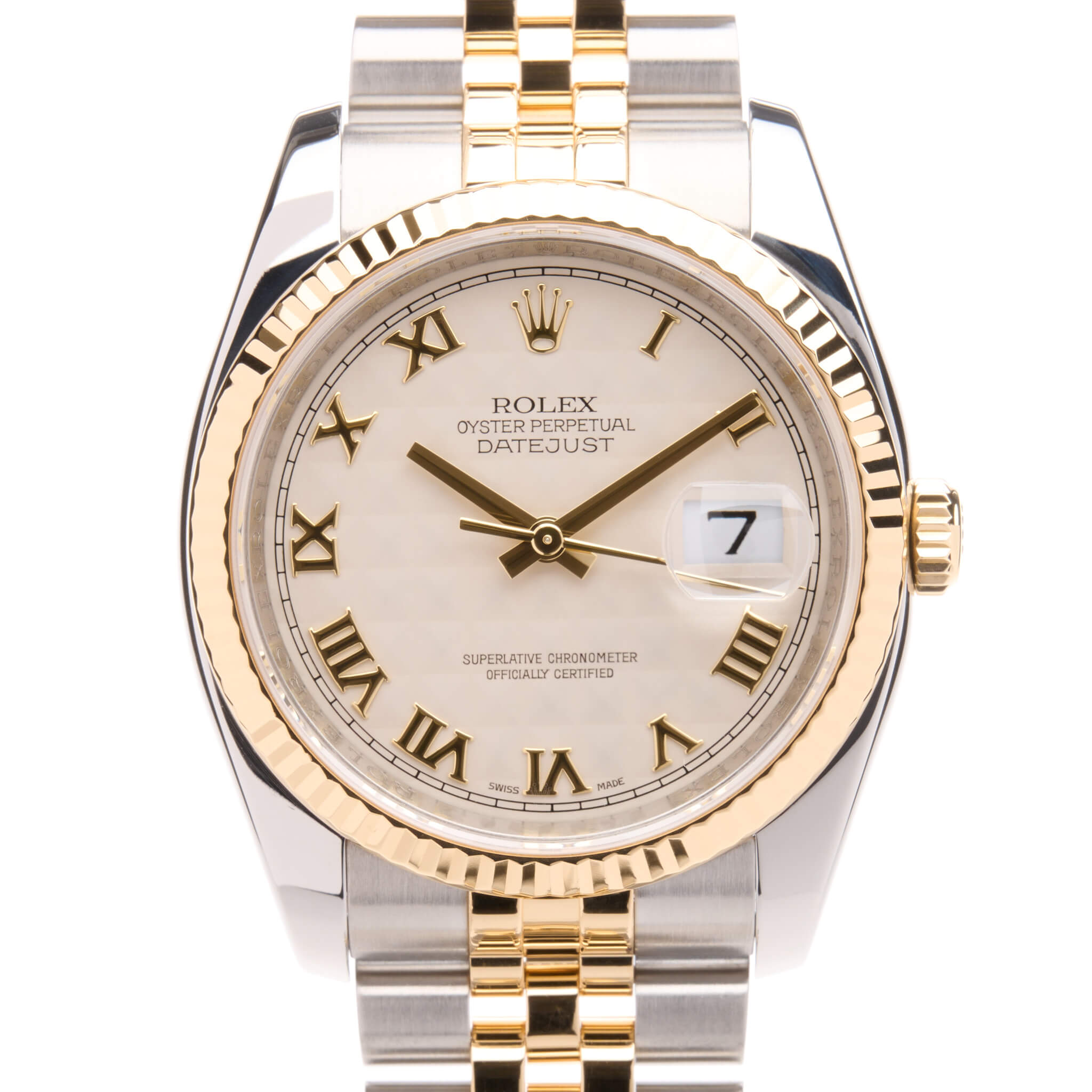 All-original preowned 2008 Rolex Datejust 36 116233 with Pyramid Ivory dial, yellow gold fluted bezel, and two-tone jubilee bracelet. All of the photos in this listing are of the actual watch being sold and accurately reflect how this watch looks in person. This watch is in stock and available for immediate pickup or delivery. In person viewings available by appointment. Serial number intentionally obscured in photos when visible.