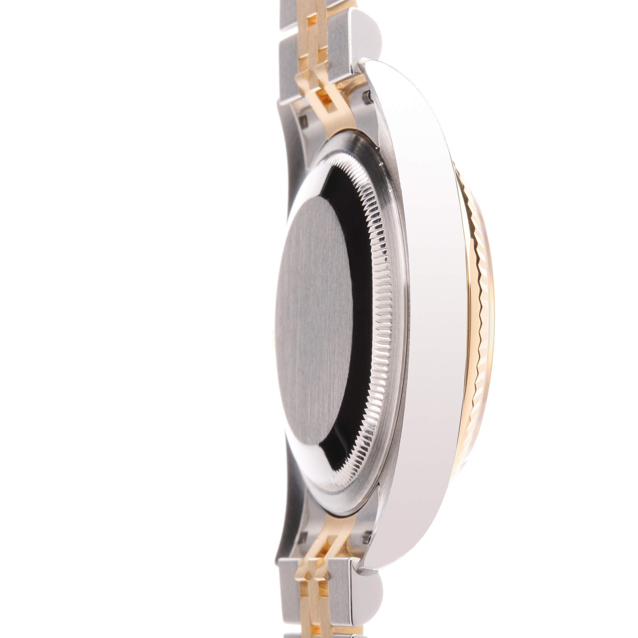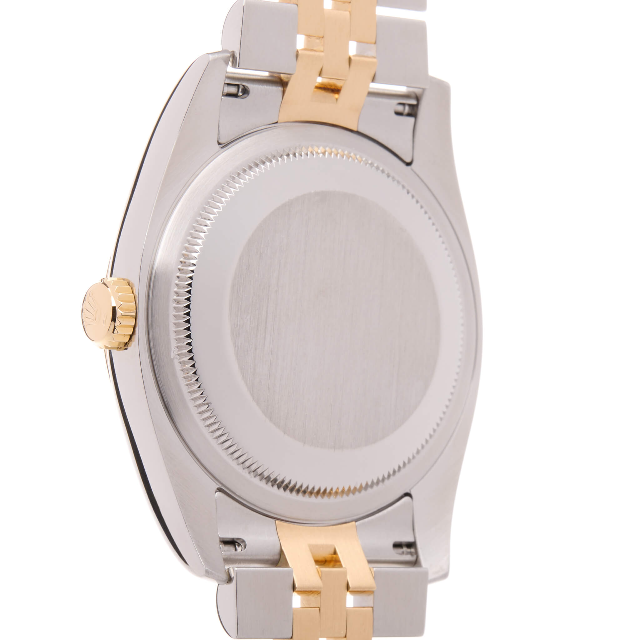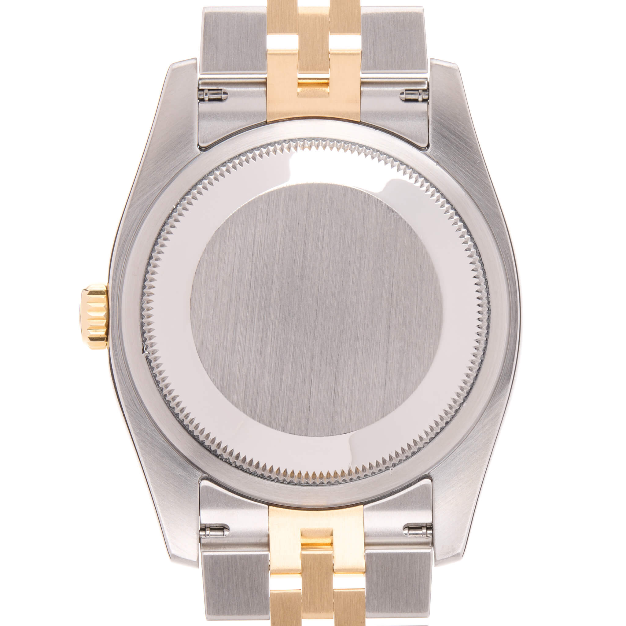 COSMETIC CONDITION: This DJ36 is preowned. There are some very small nicks on the case back and some faint scratches on the yellow gold bezel, which are visible in the photos. This watch has been professionally polished with all brushed and mirror finishes being restored to original Rolex specifications for this model. There are no dents, dings, deep scratches or other unsightly blemishes anywhere on the watch and there are absolutely no imperfections on its sapphire crystal. The original Rolex green wave display box has some light signs of wear, which are also visible in the photos.