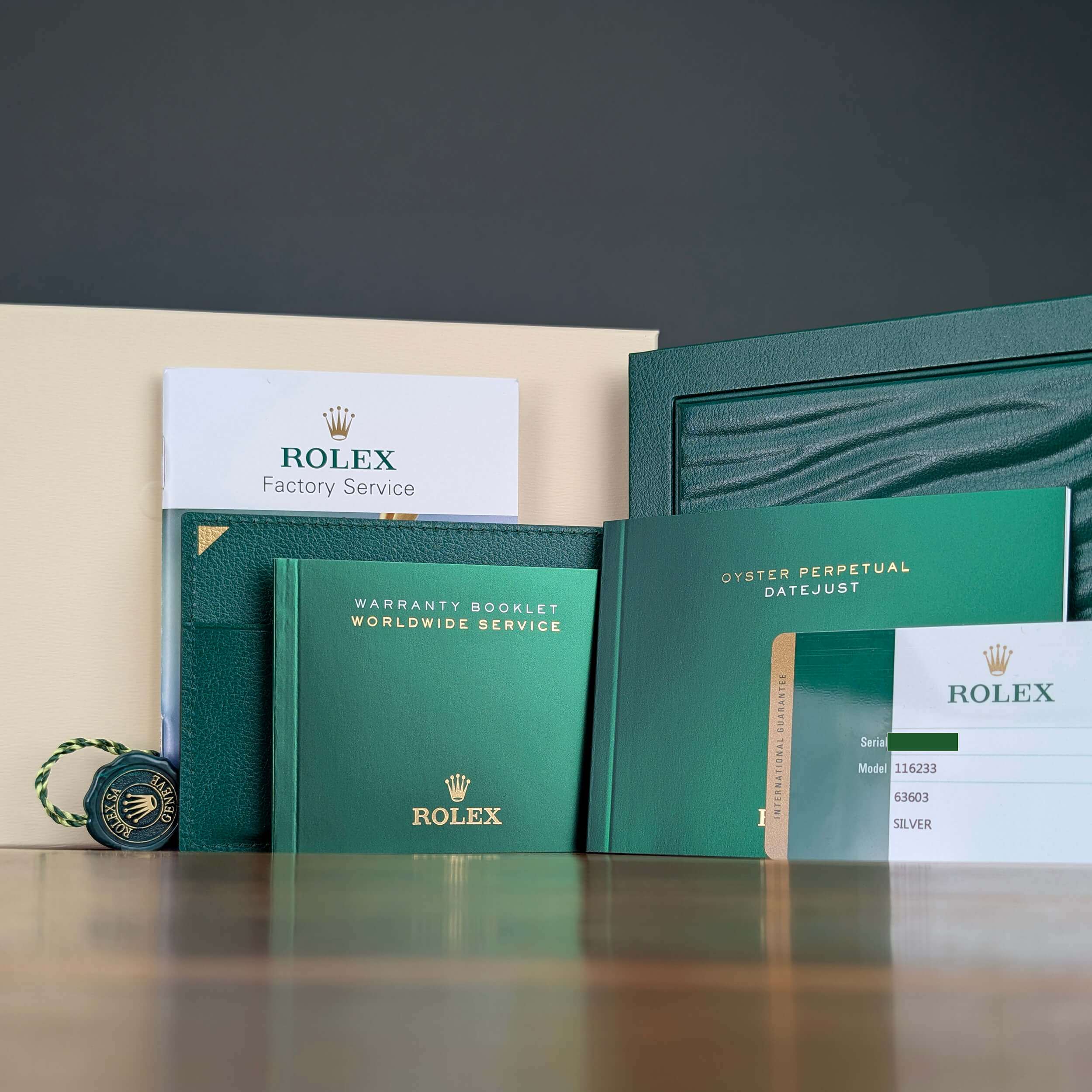 This virtually unworn Rolex Datejust 36 116233 with box and card has never been polished and still retains all of its original factory Rolex finishes. This watch is in stock and available for immediate pickup or delivery. In person viewings available by appointment. Serial number intentionally obscured in photos when visible.