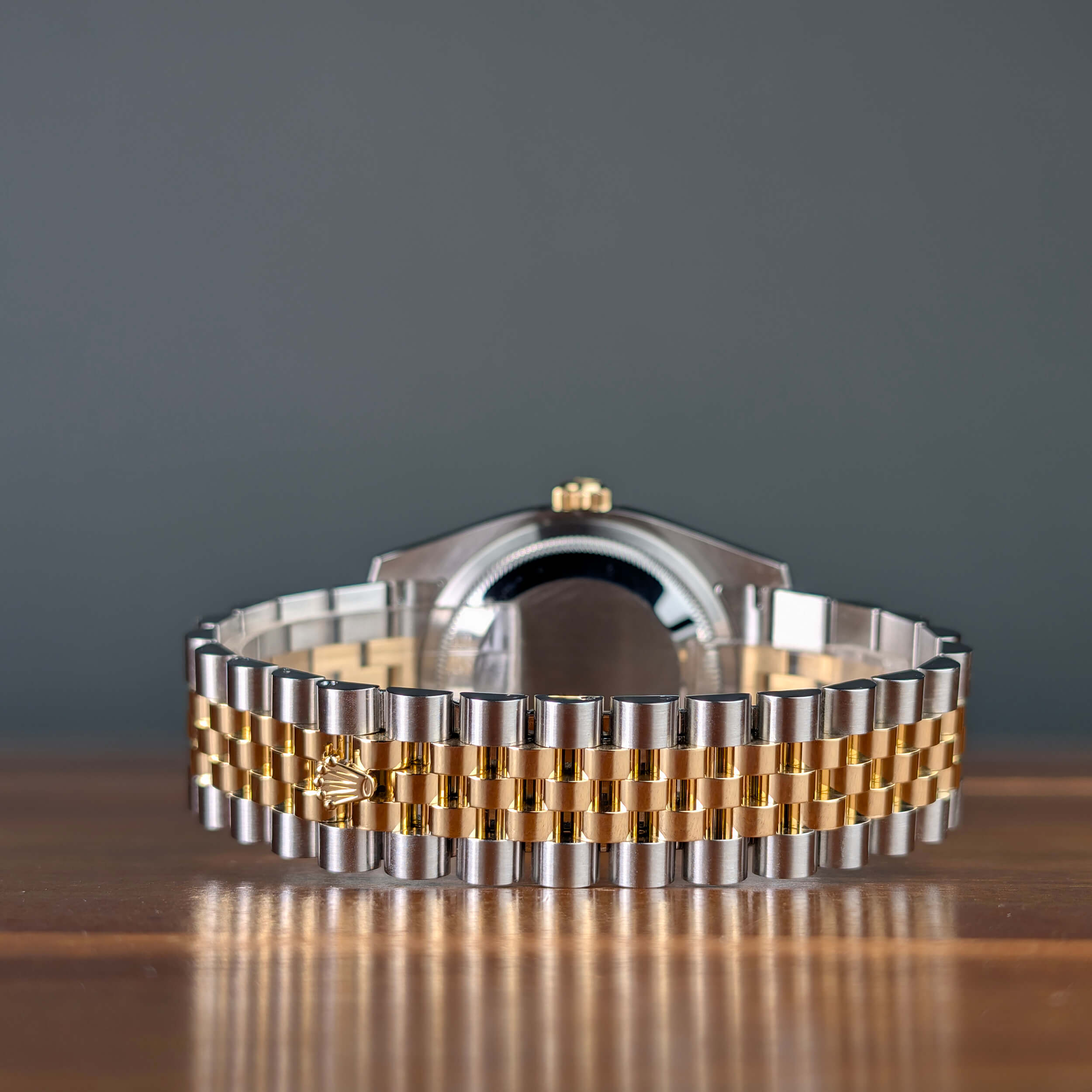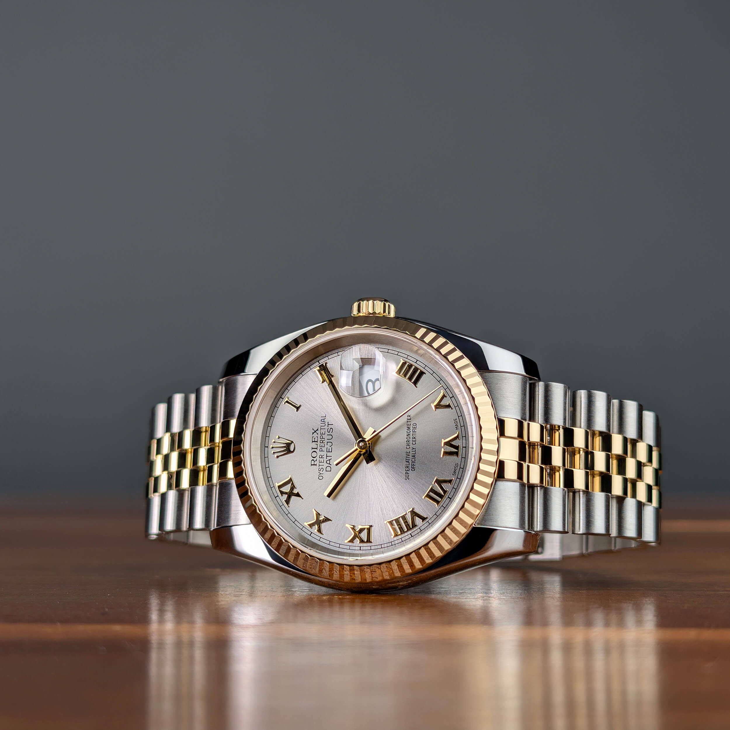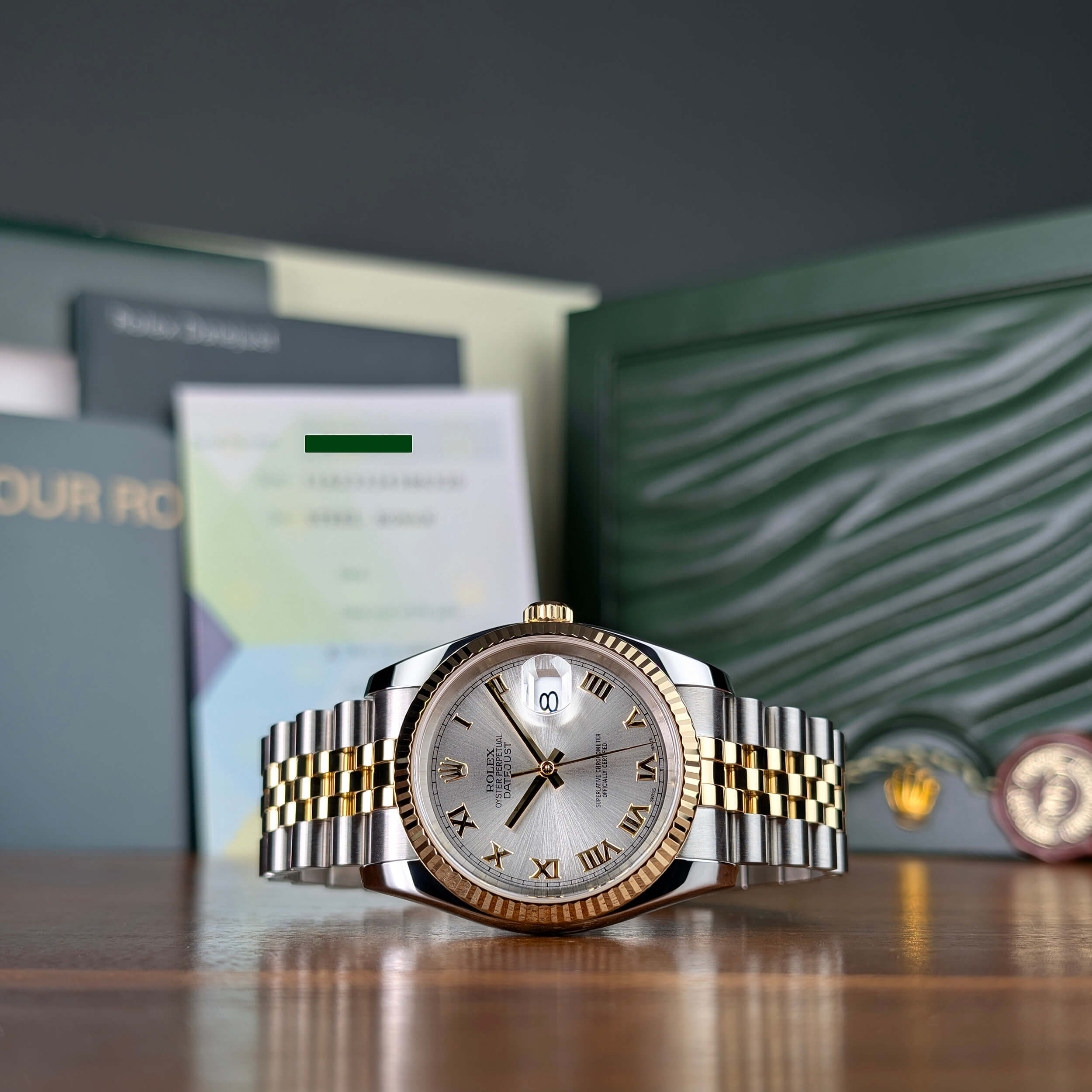 2005 Rolex Datejust 36 116233 in stainless steel and 18k yellow gold with Roman dial on Jubilee bracelet, box and papers. This watch is in stock and available for immediate pickup or delivery. In person viewings available by appointment. Serial number intentionally obscured in photos when visible.