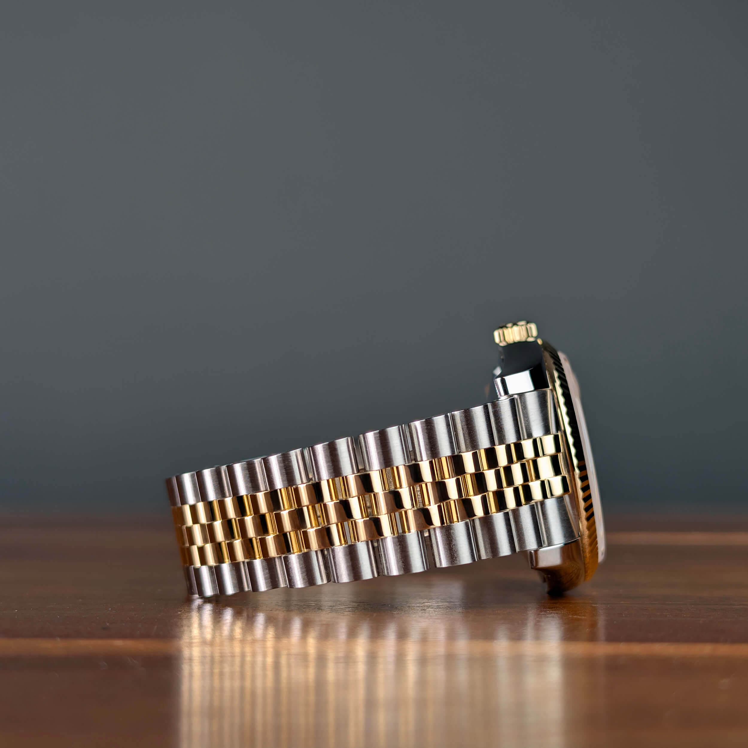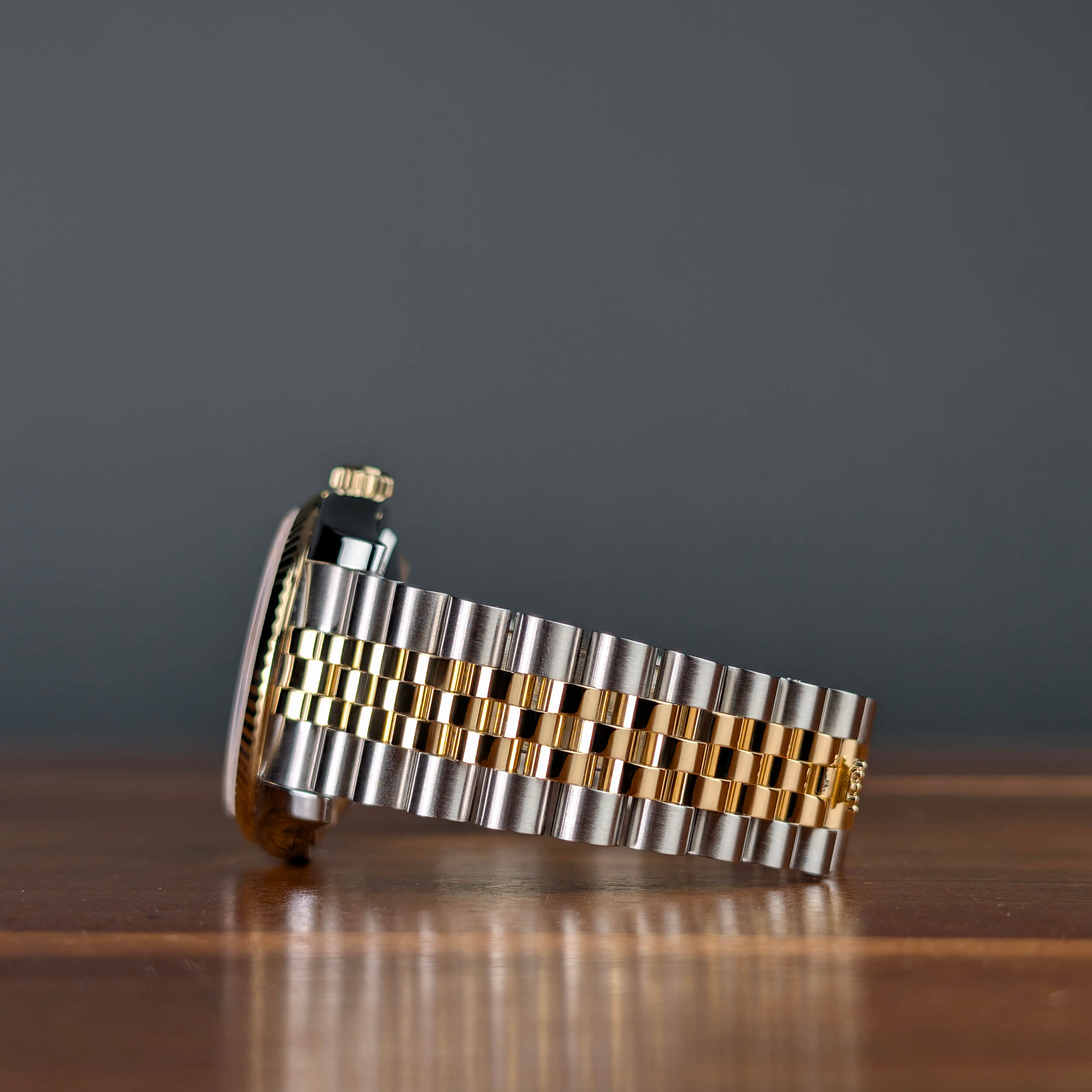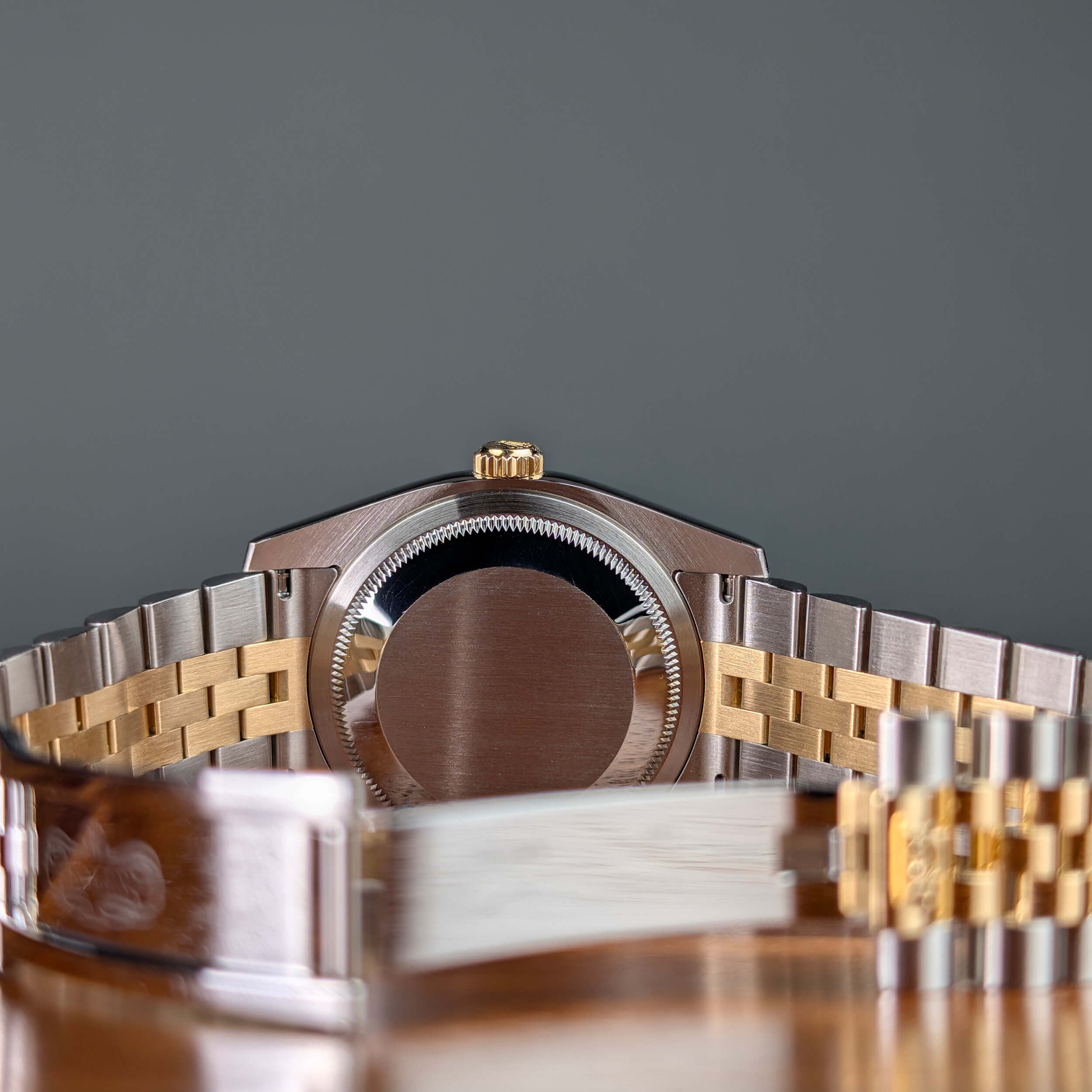 2005 Rolex Datejust 36 116233 in stainless steel and 18k yellow gold with Roman dial on Jubilee bracelet, box and papers. This watch is in stock and available for immediate pickup or delivery. In person viewings available by appointment. Serial number intentionally obscured in photos when visible.