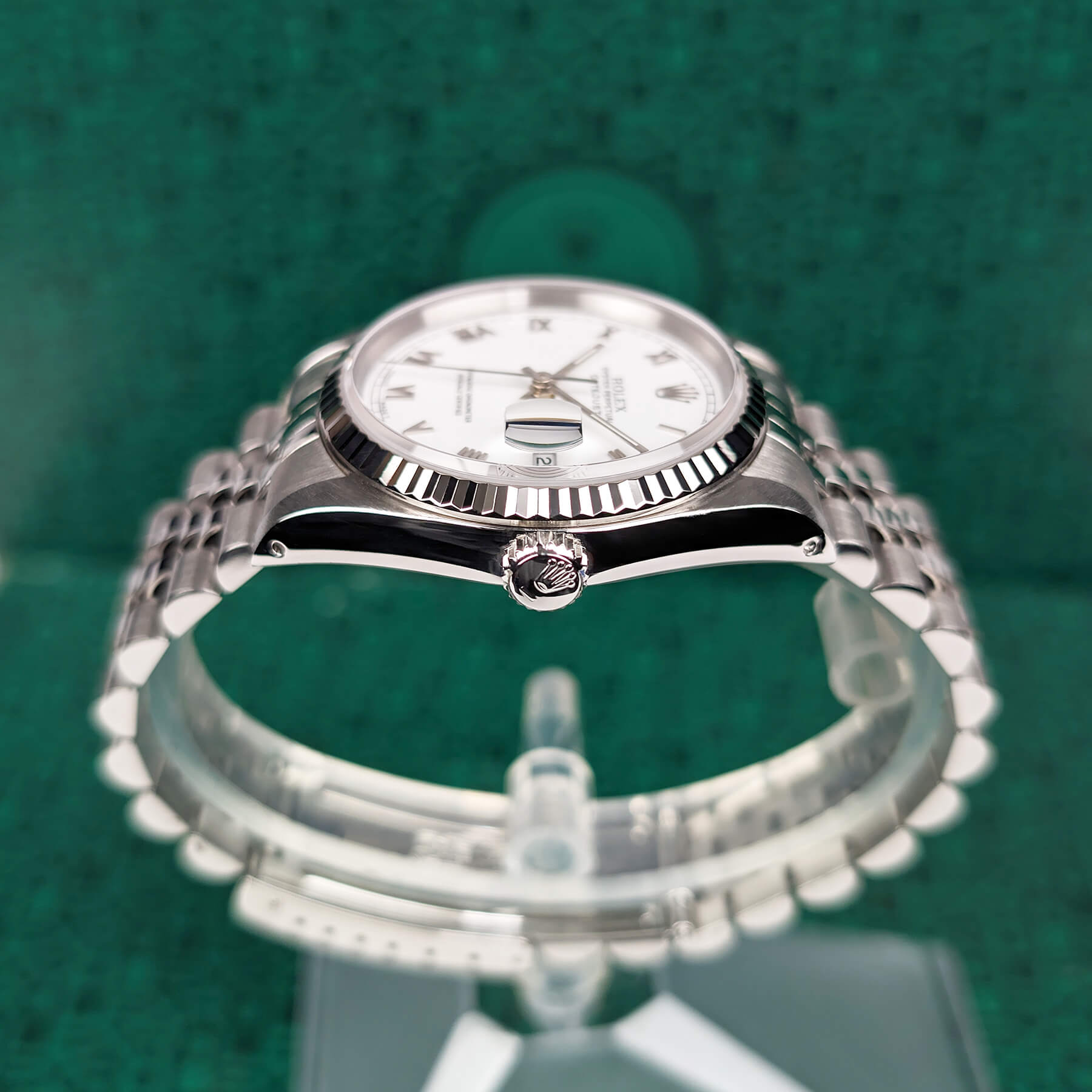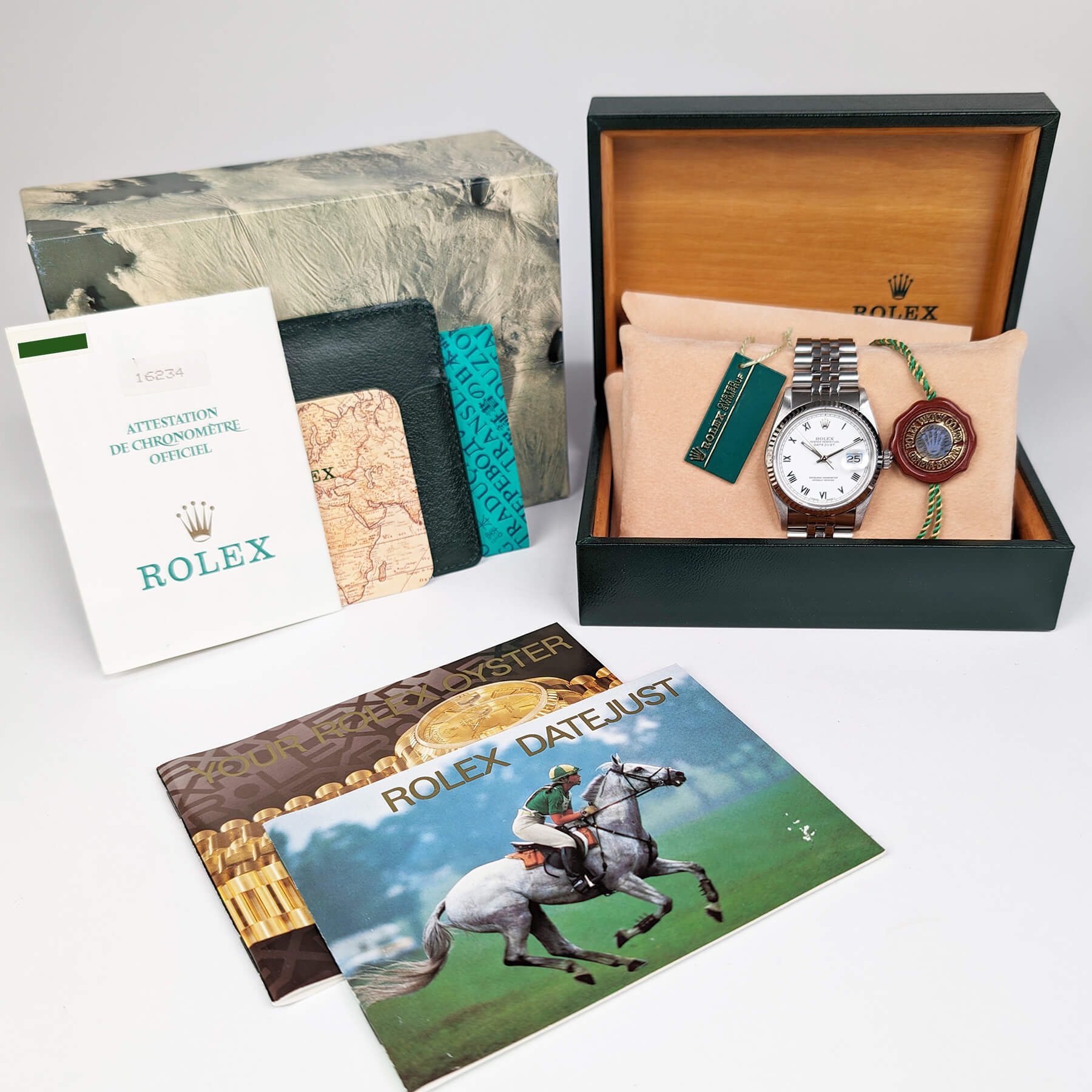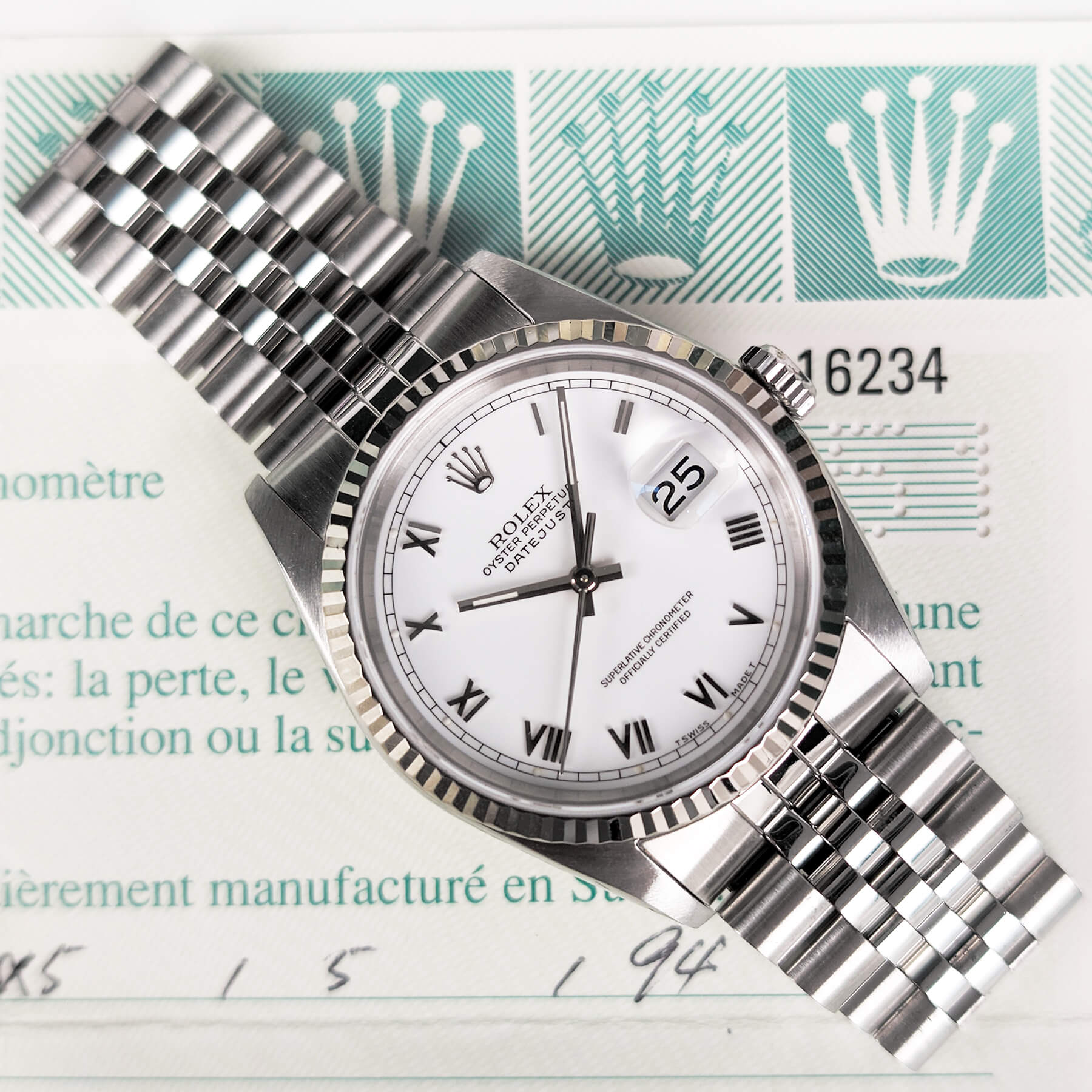 All-original preowned neo-vintage 1994 Rolex Datejust 16234 with white roman dial, fluted bezel, and jubilee bracelet – a complete set. This watch is in stock and available for immediate pickup or delivery. In person viewings available by appointment. Serial number intentionally obscured in photos when visible.