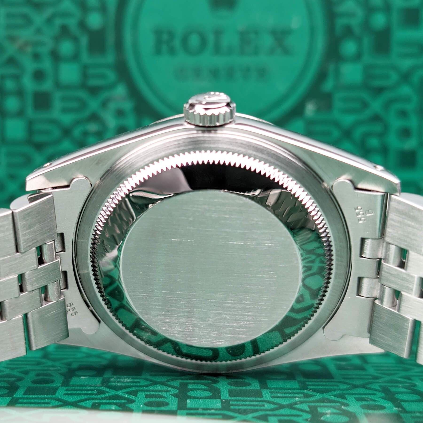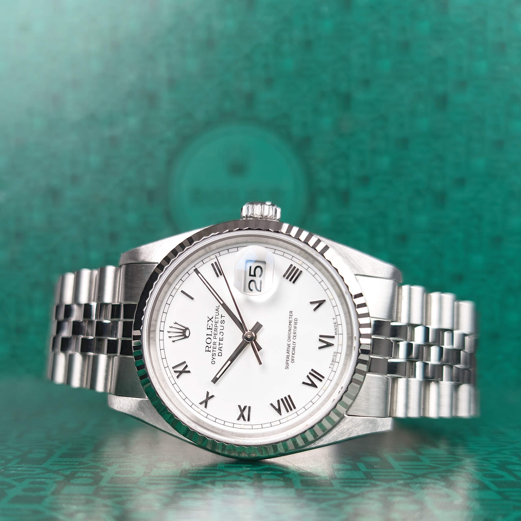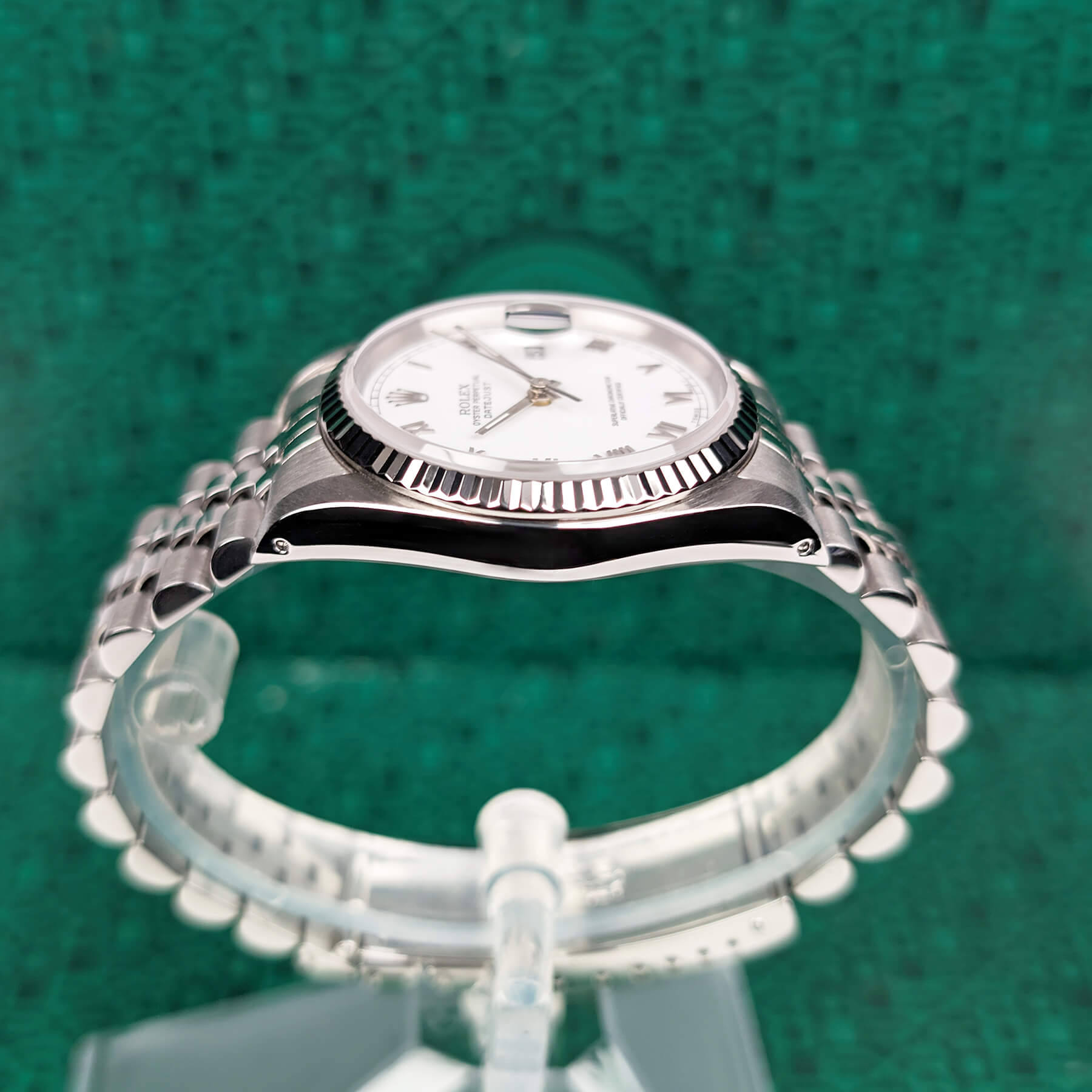 All-original preowned neo-vintage 1994 Rolex Datejust 16234 with white roman dial, fluted bezel, and jubilee bracelet – a complete set. This watch is in stock and available for immediate pickup or delivery. In person viewings available by appointment. Serial number intentionally obscured in photos when visible.