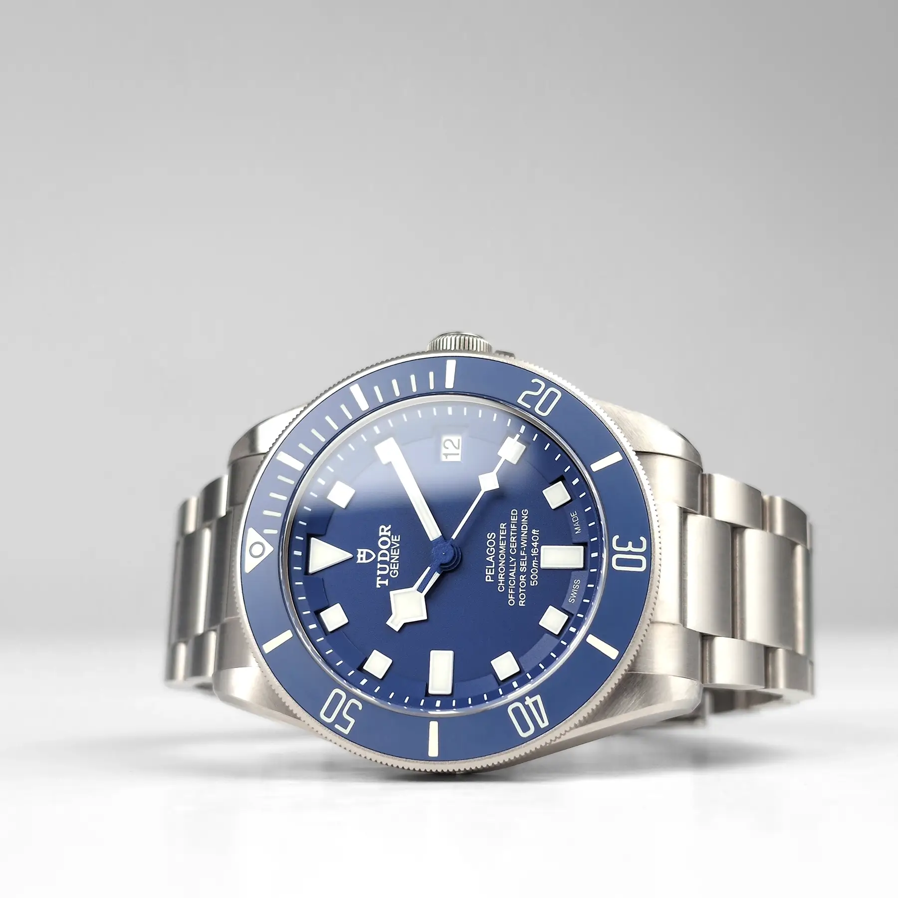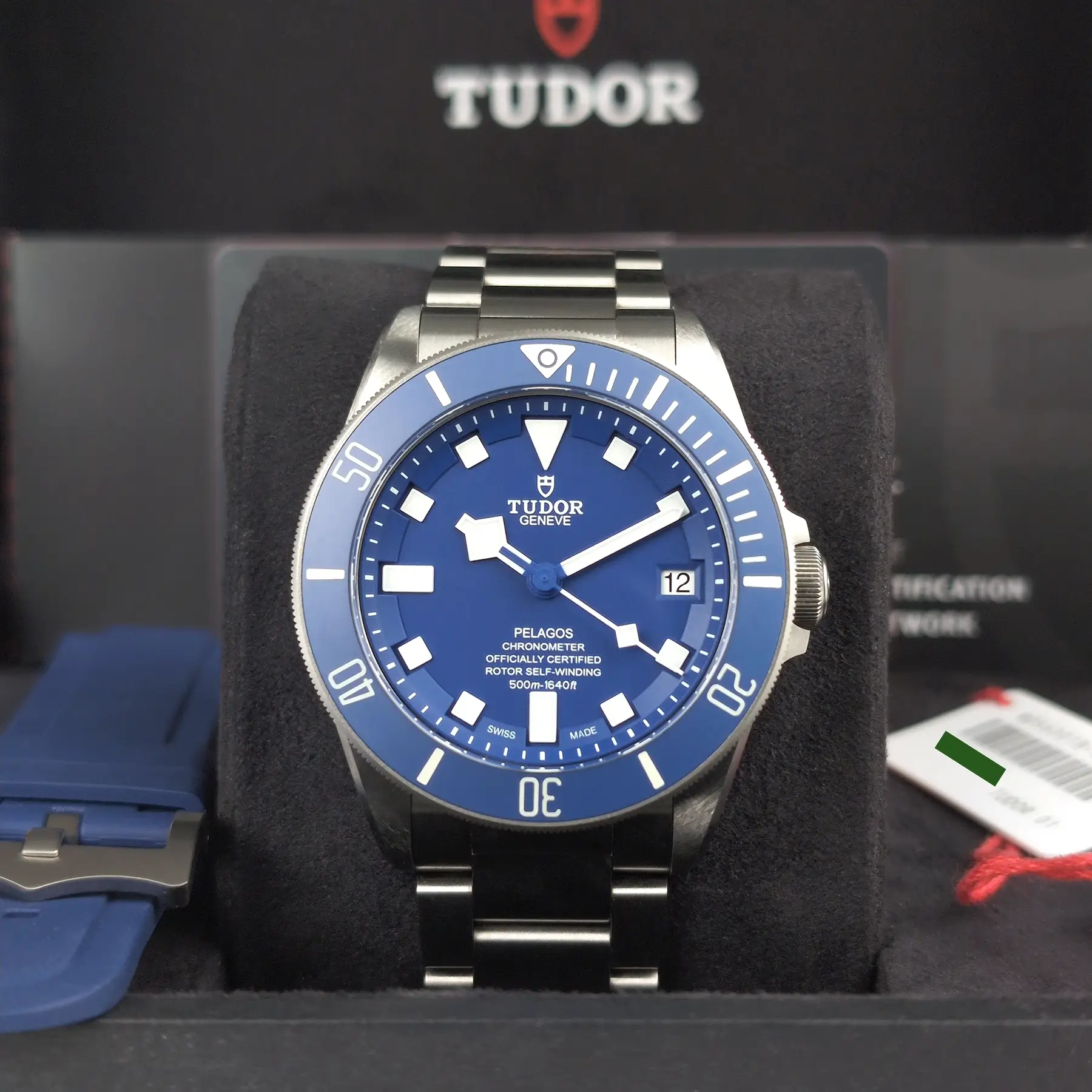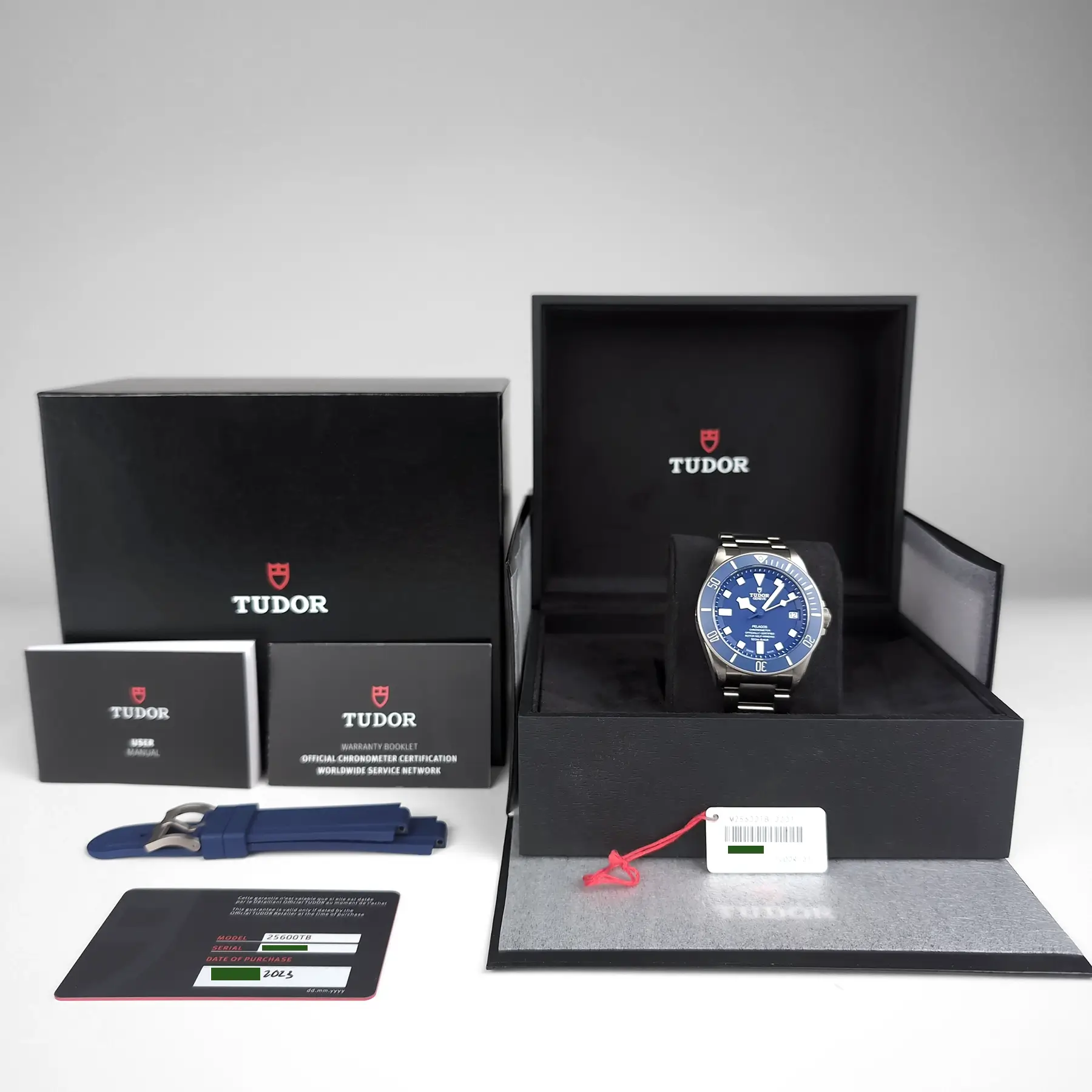Excellent condition 2023 Tudor Pelagos 25600TB with blue dial and unworn blue rubber strap with separate clasp; a full set. This watch is in stock and available for immediate pickup or delivery. In person viewings available by appointment. Serial number intentionally obscured in photos when visible.