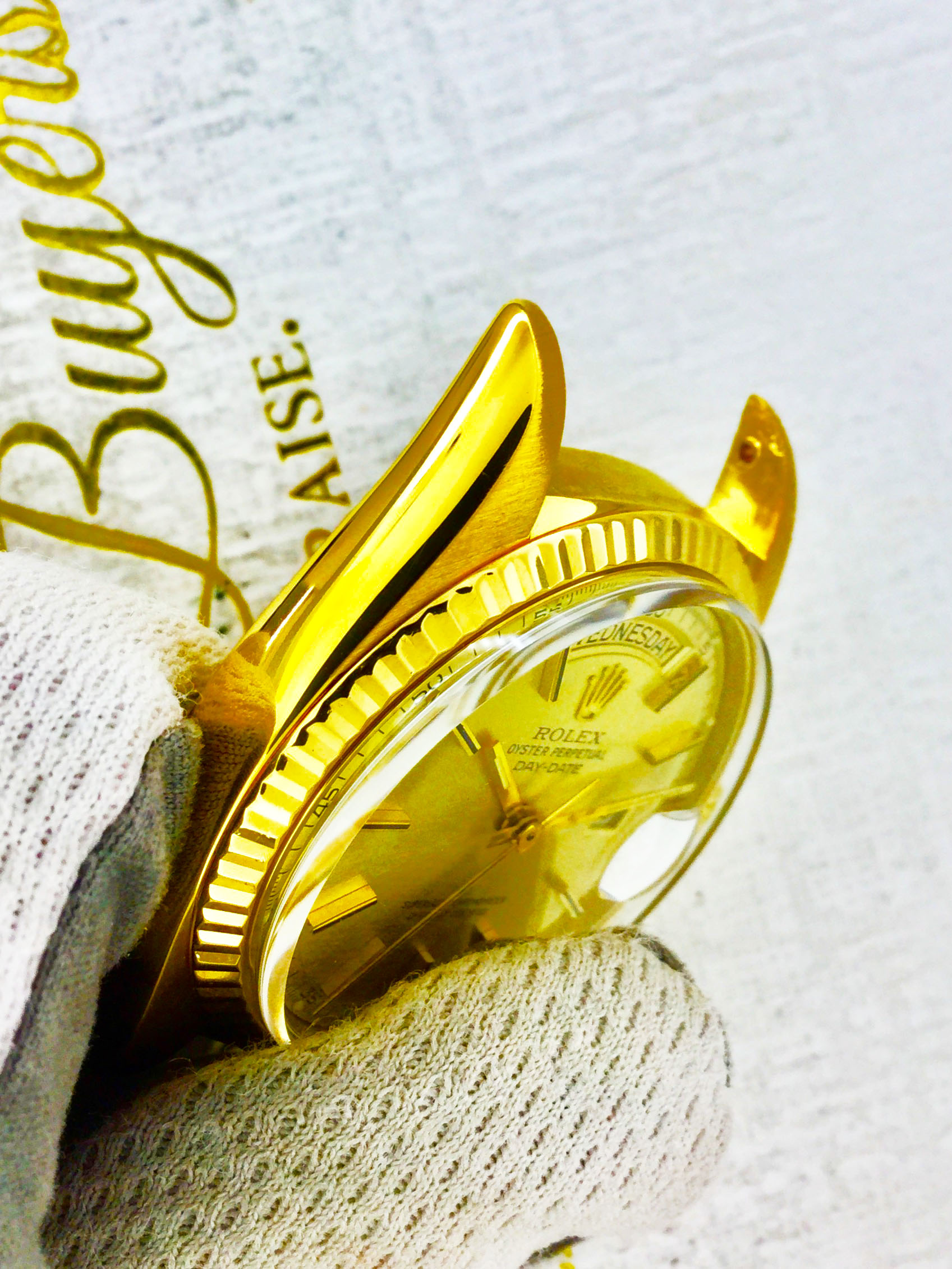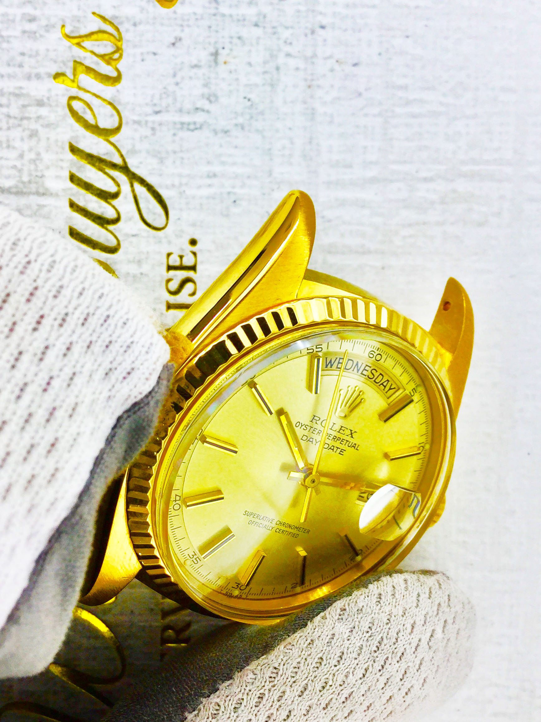 In regards to the repair of this vintage Rolex Day-Date, the affected area was rather large and in a very prominent location on the watch. Consequently, it was absolutely imperative that the color match of the gold be as close to perfect as possible. Even a minor discrepancy between the two hues of gold would have resulted in a discolored patch of metal on a large and very visible component of the watch.