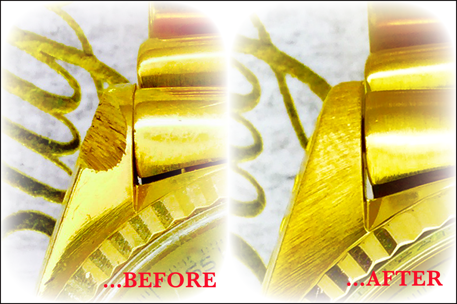 While Rolex’s proprietary blend of 18-karat gold is quite a bit more durable than traditional 18-karat gold, it is also unique in its color. That means that when severe damage occurs to a gold Rolex watch, traditional methods of re-supplying metal to the affected areas will not yield satisfactory results, since the color of the gold that was added will not match the color of the gold of the rest of the case of the watch.